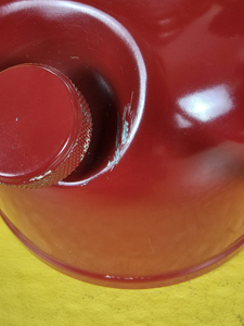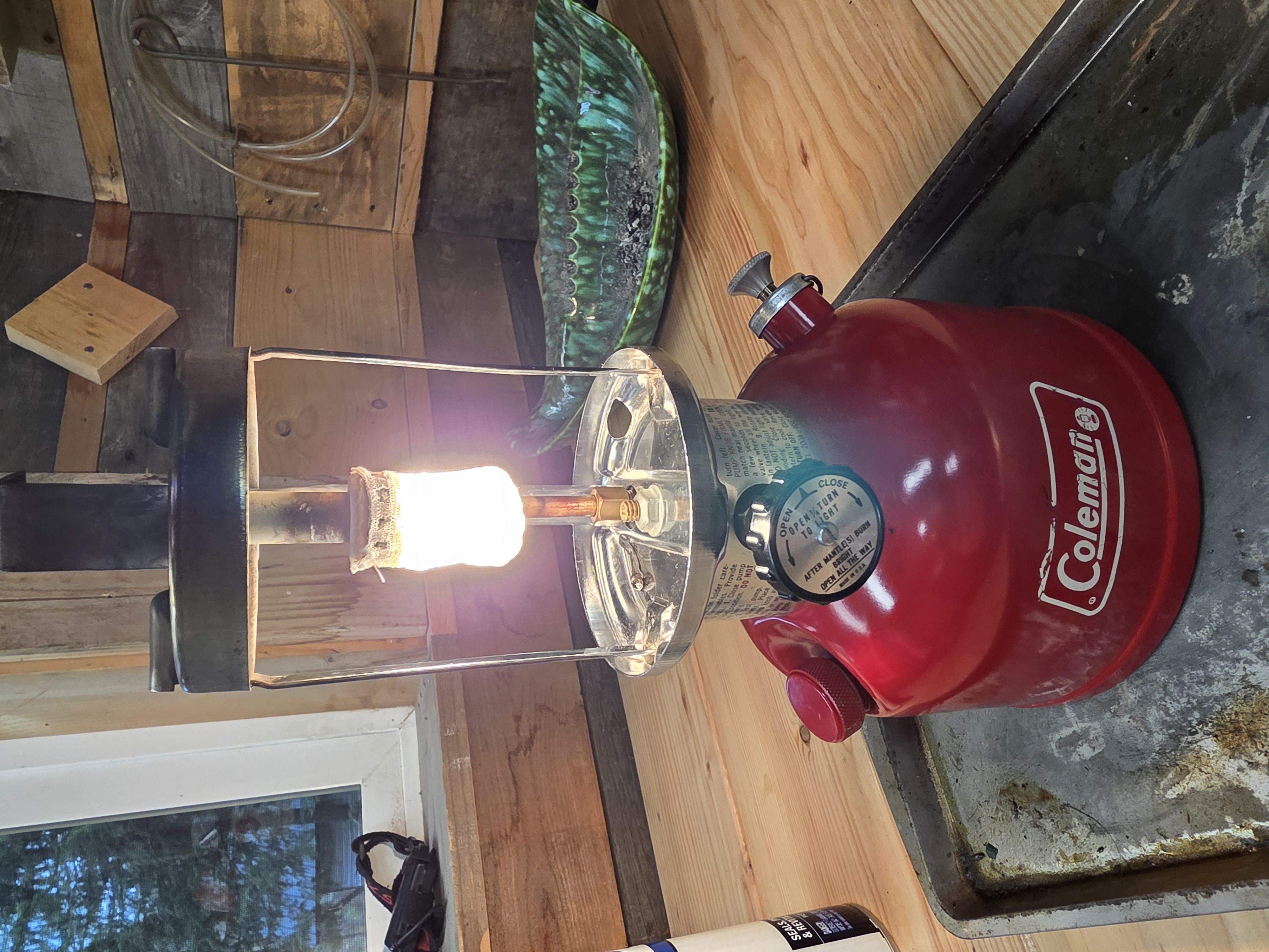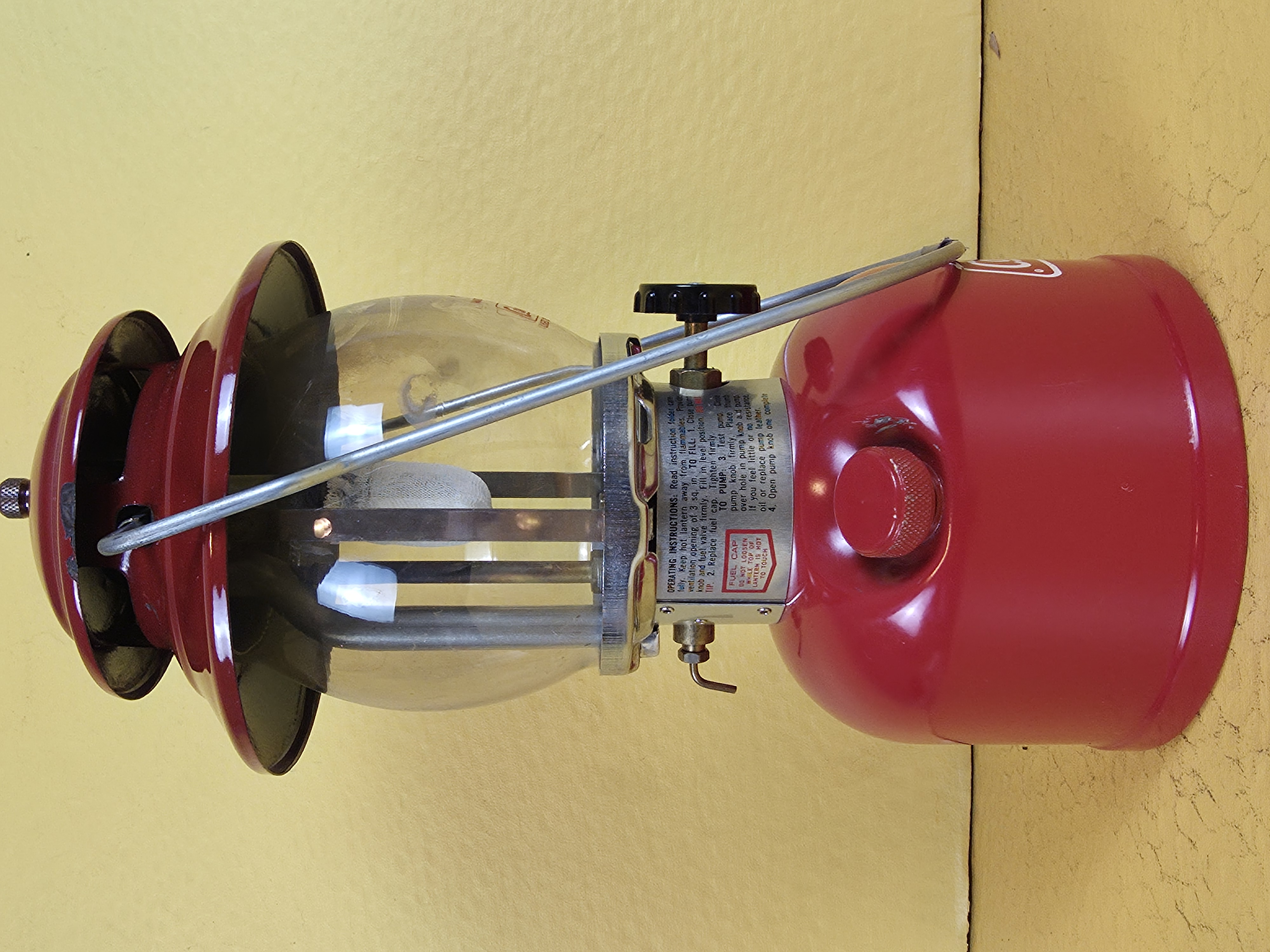There are a couple of minor chips in the ventilator, above the bail hole on the left side. The globe has two mantle burn marks in it, both smaller than a dime. The decal has "fallen" and it appears to be caused by a piece of duct tape that was put on the bail at that spot to reduce bail slap. I left the tape on the bail.