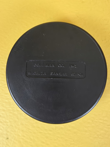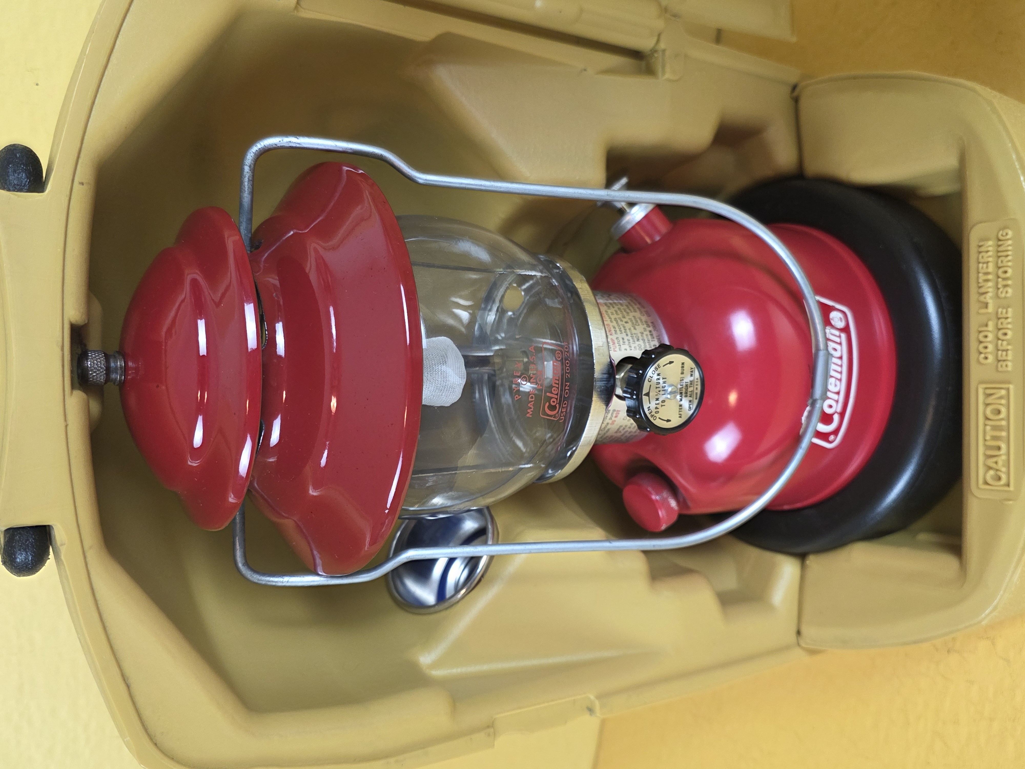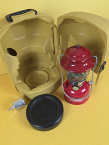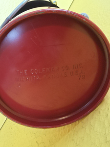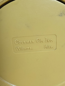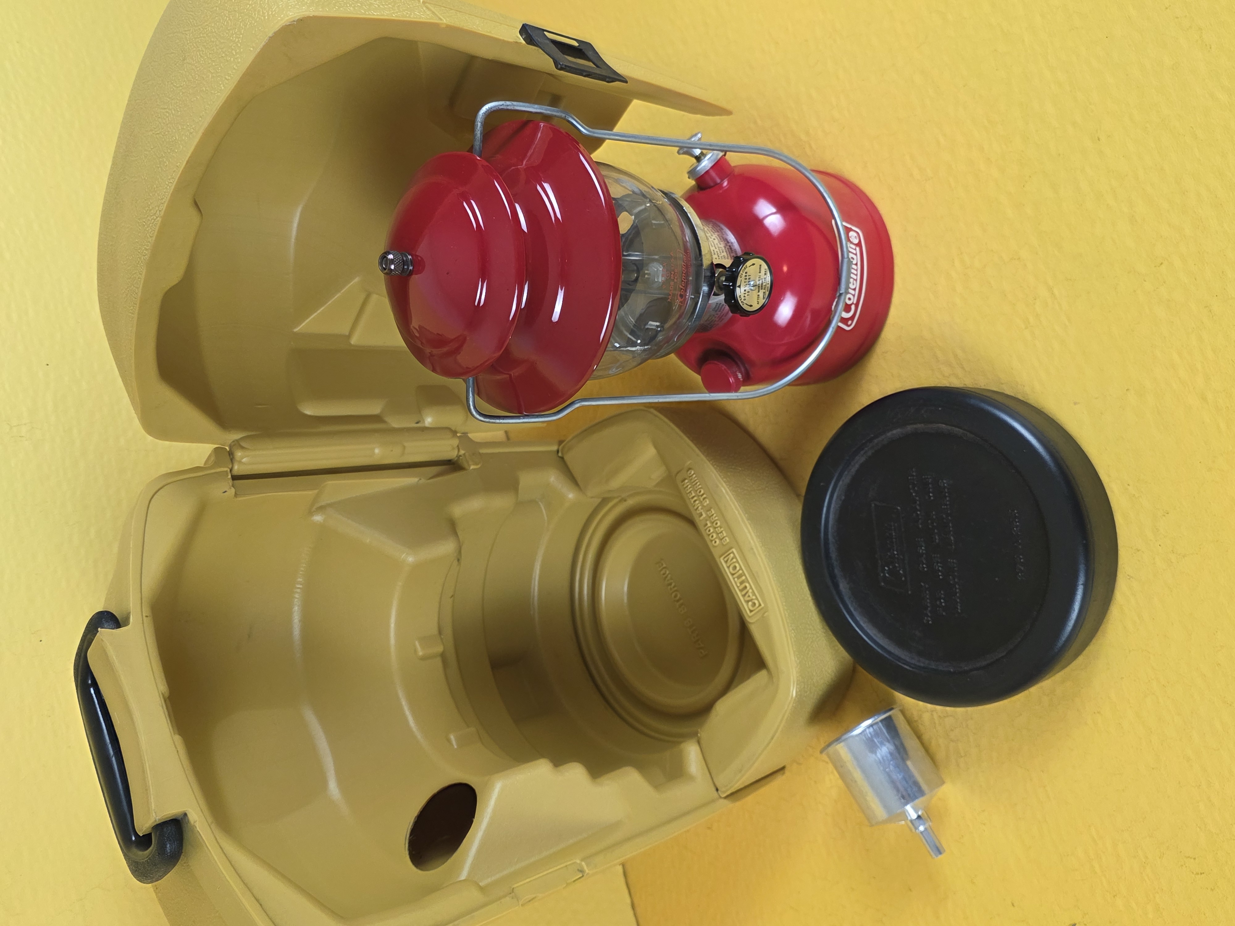 This is the only Coleman "disc" that I have ever found. They were made so that you could perfectly fit a single mantle lantern in a double mantle's clamshell case. It is undated but the lantern is stamped February of 1979 and the clamshell is stamped March of 1979. Package came to me without a funnel, so I added a pretty NOS aluminum one for you.