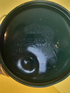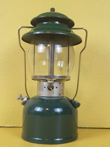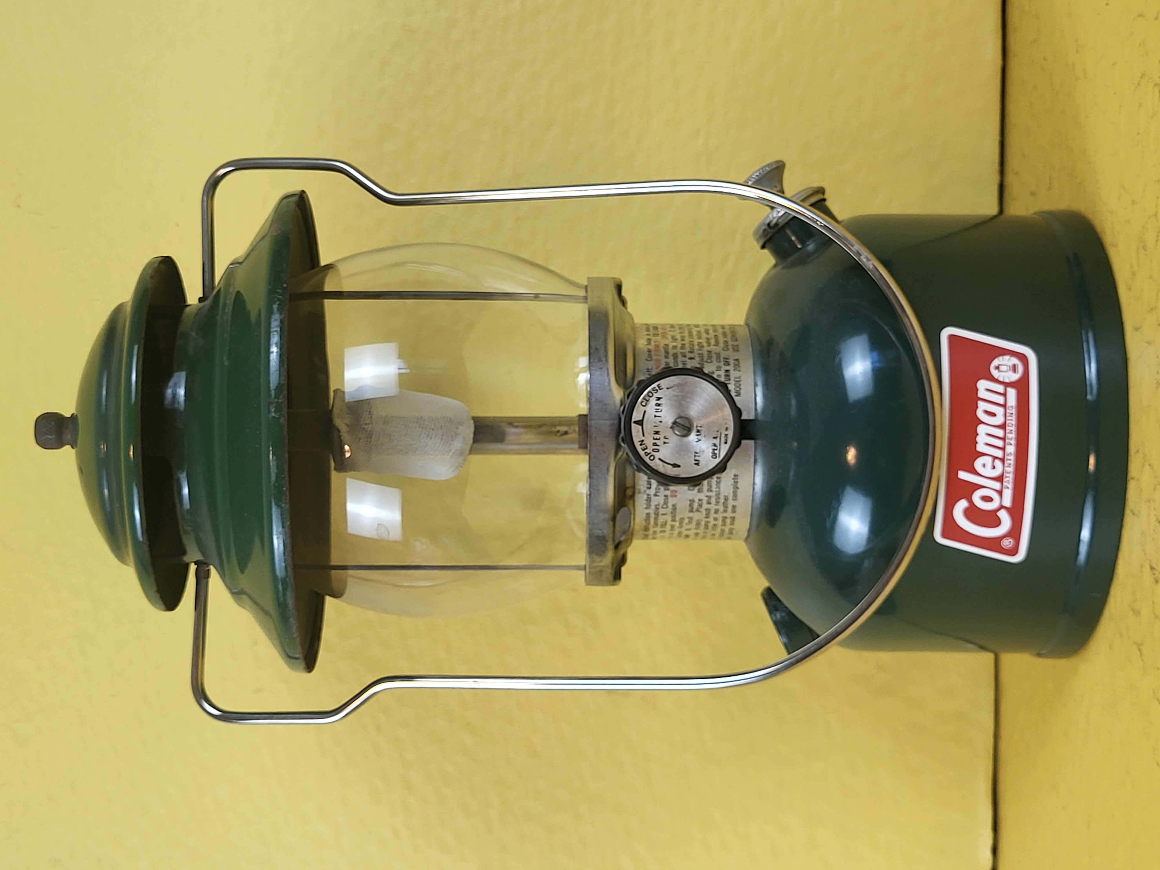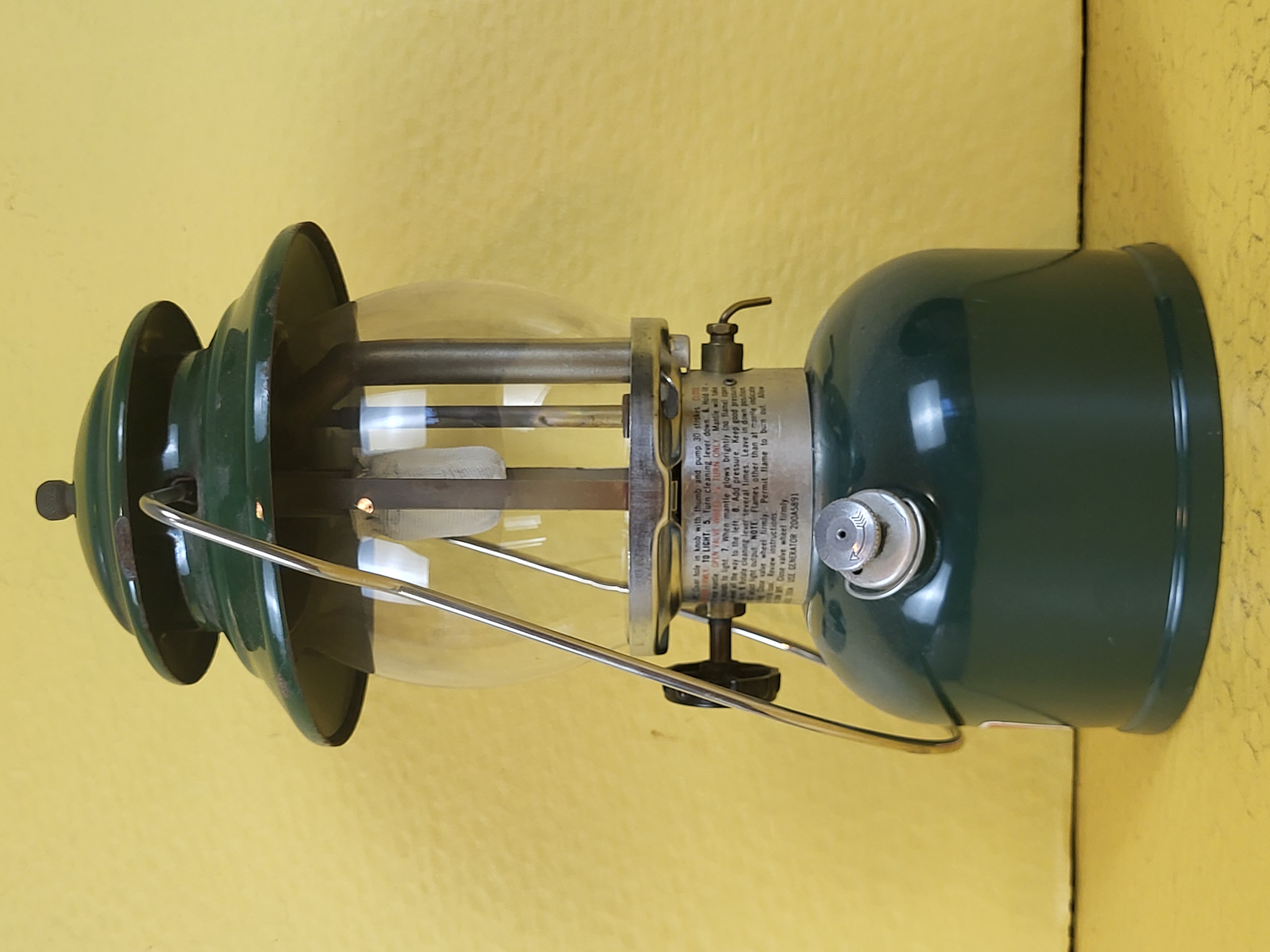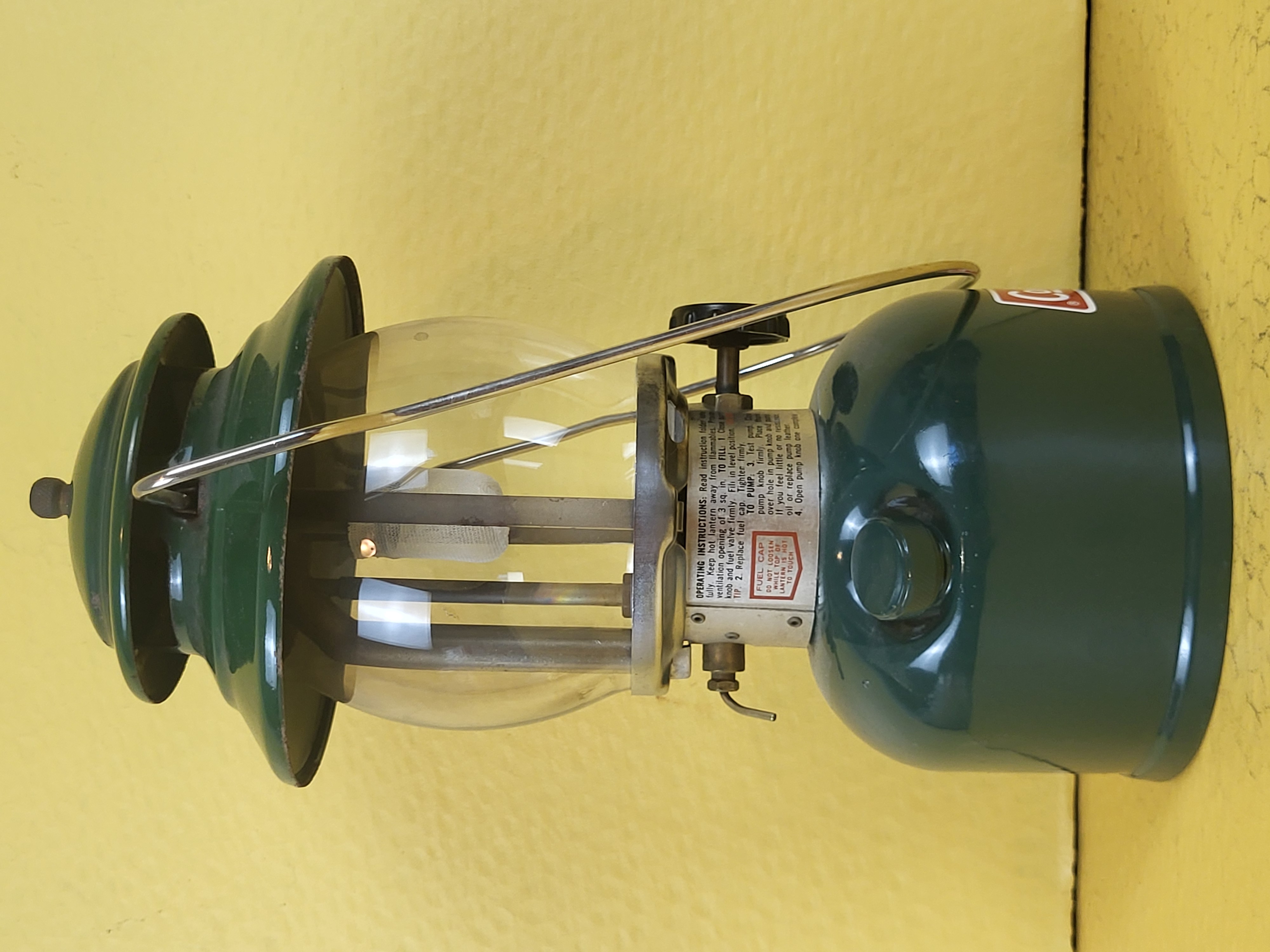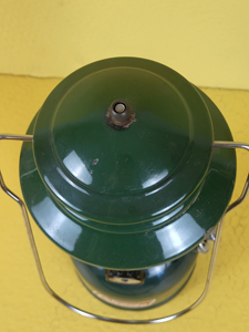 Aside from the paint job, there is some vent chipping and a little bit of rust and spotting on the frame. It appears that the lantern was disassembled to clean, but I cannot confirm that. Note the ding in the underside of the fount. And I do not see any marks in the globe. The bail may or may not be original and it fit oddly. I suspect it might be from a 200B or is a replacment.