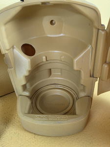 Comes in a clamshell case from 1980. There is a small ring of rust around the inside bottom, and normal light scuffing and discoloration in the plastic. No funnel.